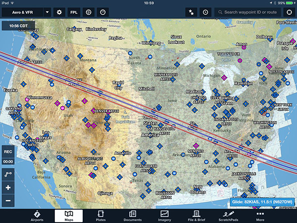 I asked WingX and Foreflight (I have both right now) if there were a way to see the path of the eclipse with airports, too, so I can determine where I'd like to try to see it. WingX had nothing like that. Foreflight did, though, and gave me permission to post their response: