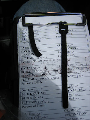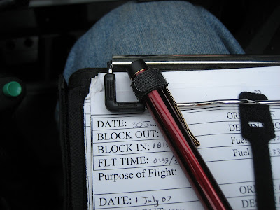 So....I had exhausted my supply of pens in the cockpit of the Val (where DO pens evaporate to?) and stopped by the dollar store to pick up a few. Knowing that it was a useless gesture, but feeling Quixotic, I wrapped some sticky-back hook Velcro around each one, and left for the night. Sure enough, this morning found the stuff unglued and unwrapped...and this wasn't even the heat of the day! (The view here, sitting on my kneeboard as I was bored and comfortably cruising at 6500') Not one to avoid an engineering challenge, and inspired by the need to do SOMETHING while the mileage clocked down to BBQ at Llano, I noticed the little Velcro cable-wrap thingies that I use to keep the cockpit neat. These little devils are made with pile on one side, and hooks on the other, and are always too long for what I need to secure - so I often cut the ends off, and have them in my little cockpit organization bag.... (note the full length "thingie" (a technical term) and the cut off tail) I suddenly had one of those "Aha!" moments...if I tucked the end underneath the pocket clip on the pen, then wrapped it around and OVER the clip and onto itself, it might just stay without any glue at all ! Well, since I had a couple of pens, and no more extra "tails", having used them to straighten up some XM cables, I pulled out my trusty miniature Leatherman and cut off a few more. Hence, the arts and crafts aspect to the story. I must point out to the young folks (and TSA agents) reading this tome that I do, in fact, carry tiny and sharp scissors on board the airplane, and they must be handled with care! :p The resulting Velcro-secured pen is satisfying and utilitarian, tested to withstand zero-G inverted without detaching itself from the glareshield, and sure to last at least until the pen disappears into whatever black hole that claims all of my pens eventually.... Hey, I never claimed it to be rocket science! But at least it isn't all gooey and sticky..... ;) Hope you all had a rewarding flying weekend! Paul |