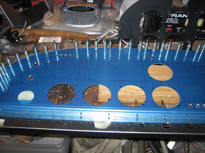 There are a lot of options these days for making your instrument panel. You can lay it out in a CAD program, then give a file or drawing to a shop that will cut it out for you. You can have a friend that knows someone that has a cousin the owns a laser or water-jet take your drawing and blank panel and return one with holes. You can ditch the blank Van's panel entirely and buy a custom-made panel cut to your specifications. Or?.most radical of all?you can take van's blank panel, lay out the design of your choice, and actually cut some metal by yourself! Of course, this is a personal choice based on your own skill assessment, but I'd like to propose that anyone who has built the airframe has acquired enough metal-working skills to accurately cut a few holes in a sheet of aluminum. I am finishing up a new panel blank for Louise's -6, and came up with a few thoughts and tips that might be useful for others who choose to go the "traditional" route?