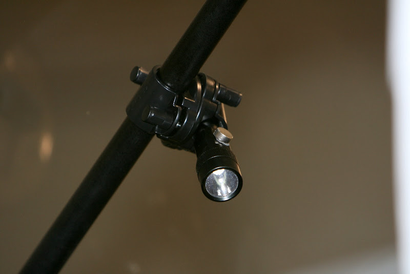 Nice set up. Try mounting the flashlight on the rear of the canopy so when it is open it is out of the way. Also, at night you'll need the at more of an angle to the surface you want to illuminate.