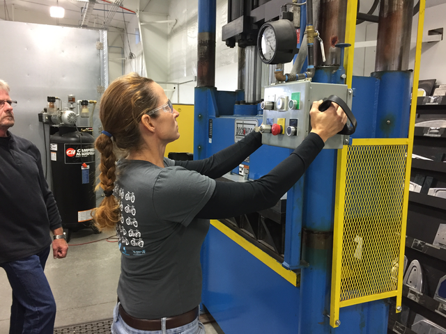 Tanya literally hijacked the shear press from Rick. "Bang" (1/8" steel hitting the floor). Tanya's head popped up from the task at hand and off she went in search of mischief. "Can I work it!?" "Of course. I need 12 just like this." Yeah, right, like poor Rick had any chance.