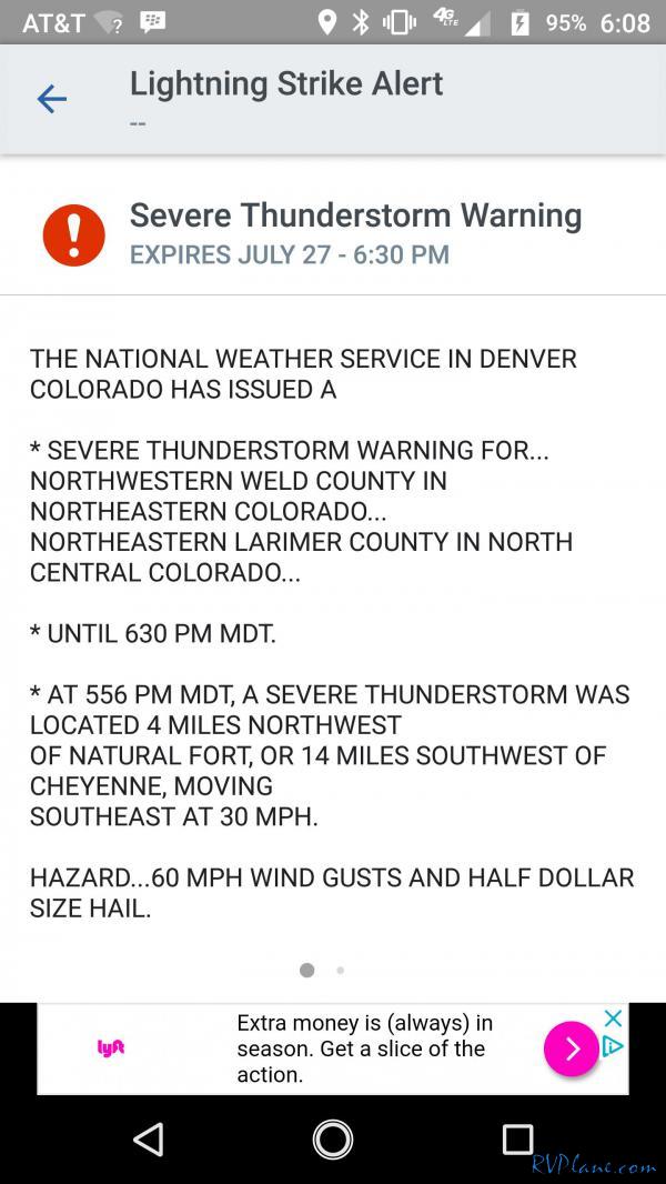 This was my biggest fear of leaving my RV parked outside at Fort Collins - hale damage. Just a few weeks ago my friends got caught in a storm with golf ball sized hale which did a number to their car. I can only imagine what it would do to the RV.....luckily it ended up being a false alarm and the RV remained safe.