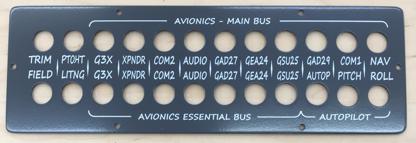 The Garmin LRU’s fed by these breakers have two power input pins each, P1 and P2. Each device draws power from P1, which is connected to the main bus via the top row of CB’s, but if for any reason P1 power is lost, it looks to P2. In effect, switching Aux. Avionics on does not actually result in any current flow unless the main bus gets shut down. This means that a selection of avionics remains available from battery power if the master has to be shut down, but also allows pre-start use of avionics on battery power without energizing the main bus, handy for flight planning. The three CB’s not included in the lower group are for the GTN750 and the GAD29. Conserving power after an alternator failure can be accomplished by selectively pulling some of the lower avionics CB’s.