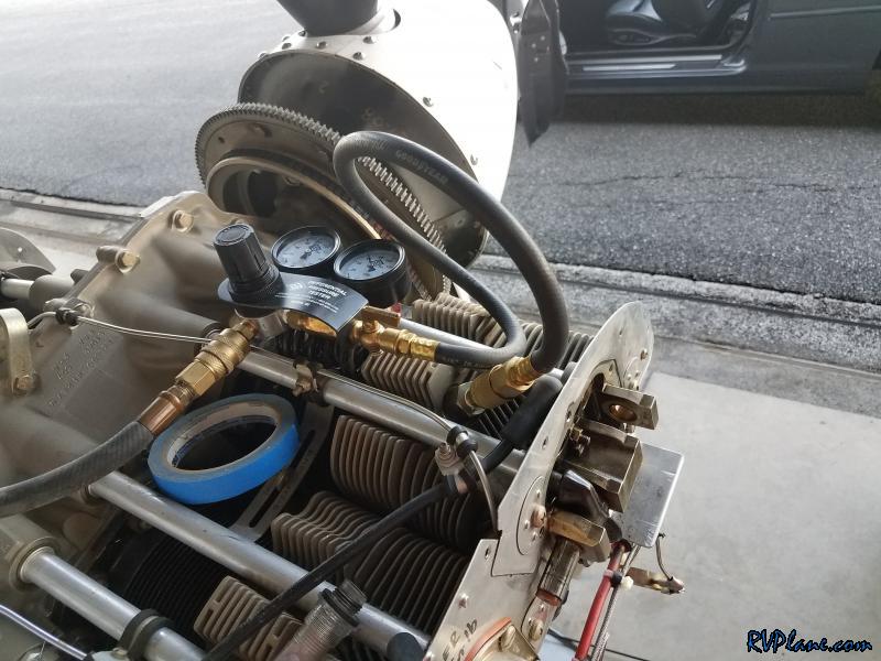 The only thing I changed from my original write-up (besides my new and improved valve compressor) was my method of keeping the exhaust valve seating for installation. Originally I used the "Rope Trick". One thing pointed out to me was there is a small chance of the rope forming a knot inside the jug, and then you have to yank it to get it out. So this time I tried using compressed air, delivered through the differential compression tester. I rotated the prop until the #1 piston was at the bottom of its stroke and the intake valve was closed. 60 psi of pressure seemed to be the right amount to keep the exhaust valve forced tight enough against the seat to install the springs.