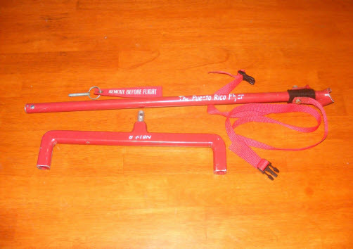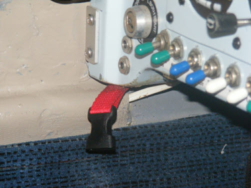 The elevator/aileron lock is made from 0.118” steel hinge pin which is inserted into holes in the panel flange. The seat belt is pulled up tight around the stick.