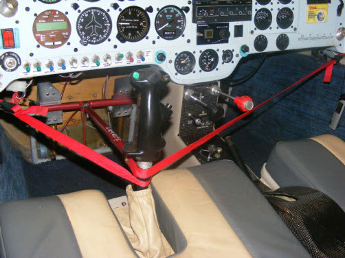 The elevator/aileron lock is made from 0.118” steel hinge pin which is inserted into holes in the panel flange. The flange holes are small which stops the lock falling to the bottom of the stick. Mine is slightly spring loaded pushing up against the bottom of the securely fixed stick grip. The seat belt is pulled up tight around the stick.