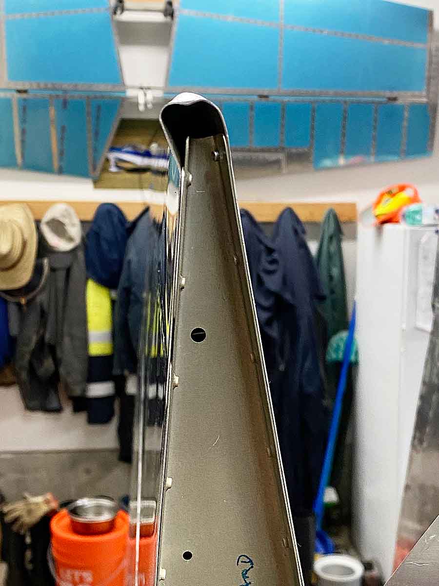 Michael, your second picture shows that the damage can be worked out fairly easy if you drilled out the rivet on the end rib and removed it. Then use some wedge shaped dollies/bucking bars and a flat faced hammer to bring back to its original shape. Then just re-rivet the end rib back in place. Follow it up with a small amount of filler if necessary for a smooth appearance.