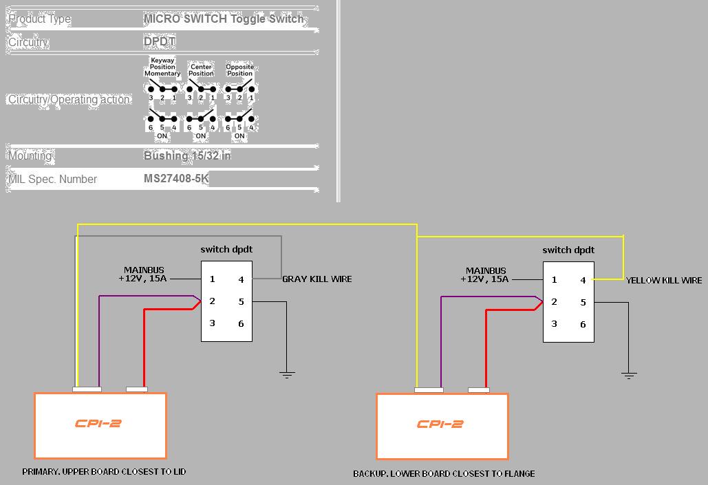#2: I'm interested in the "switchology" for the CPI2. I'll be full electronic, and thus running a dual ECU unit. I intend to use toggle switches, not a key switch, for ignition control. My current schematic iteration has two DPST switches, one for each ECU. Each switch controls power to the ECU and coil (purple and red wires) for that ECU.
