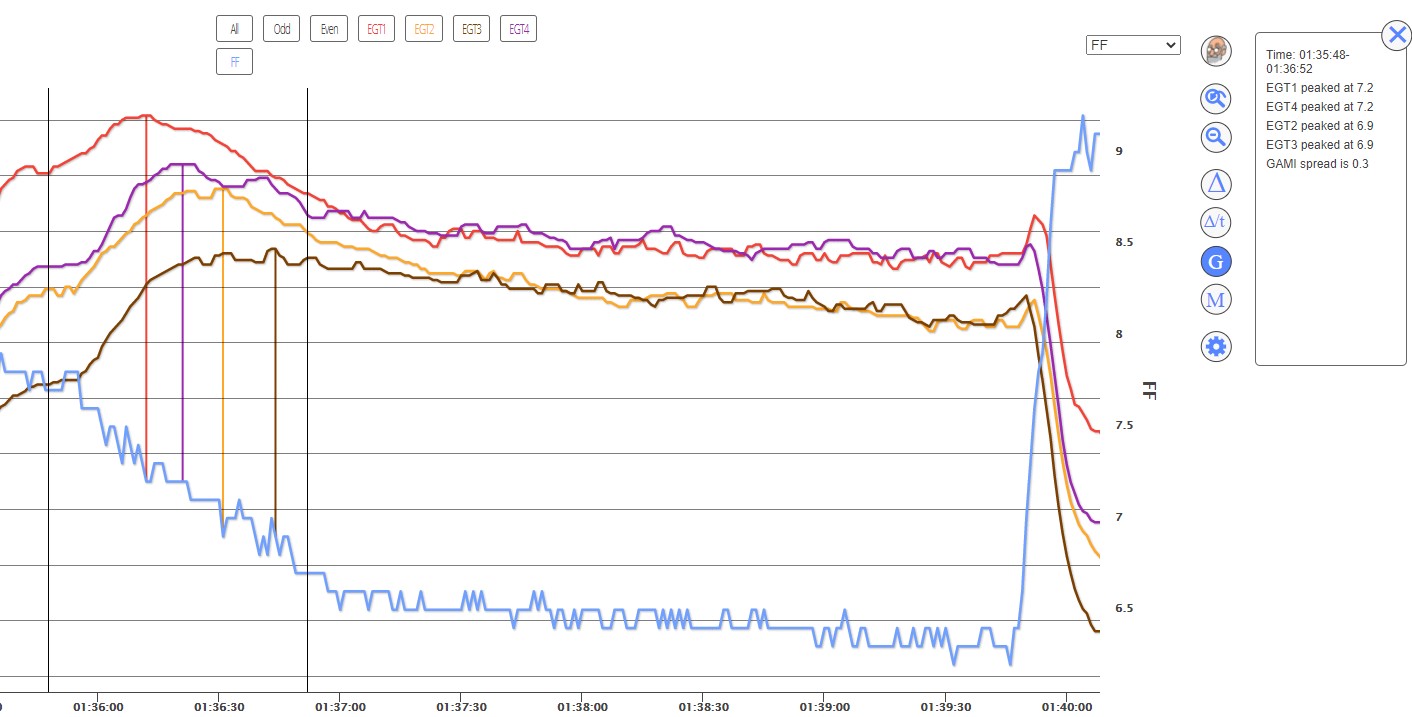 I'm tuning my new AFP system right now. Here's a chart from a test run this past weekend. Click the "G" in a circle icon at the upper right to enter GAMI mode. Then click the cursor at a point before the first cylinder peaks, and again after they've all peaked. Savvy will immediately show you the peak for each cylinder and the spread.