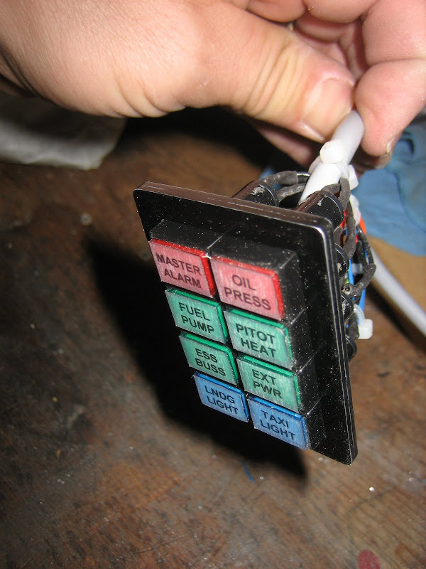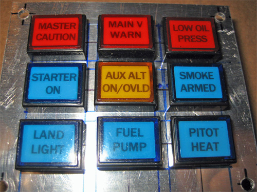After finding some nice 12 volt LED indicator lamps, and using them for a single-row annunciator panel in "Mikey" (Louise's RV-6) I decided to try and build a multi-row unit for something I have in the works. Since my original one was built to connect to the airframe through a nine-pin D-Sub connector, it was easy to build a drop-in replacement (all I had to do was dig through my stack of building notes to find the original pin-outs....)