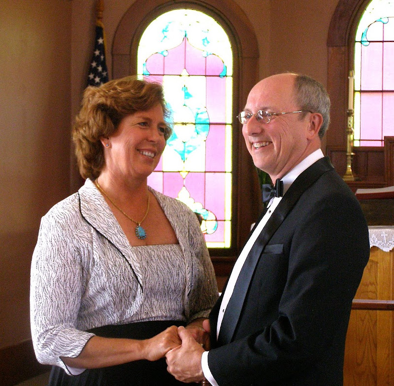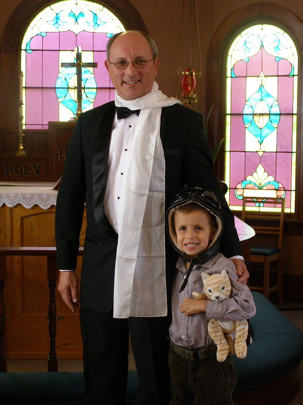 Mikey (RV-6) and the Valkyrie (RV-8), along with Bear (intrepid Aviator / Guardian of Louise) and Karst the Wonder Dog (who accompanied them on the trip) wish to announce that at 1630 hours on 6 September 2008, Louise D. Hose and Paul F. Dye were united in Marriage at the little country church on the hill near Verndale, Minnesota. The weather was reported as Winds light and variable, with scattered clouds at 4,000?, visibilities unlimited, with moderate temperatures. No airplanes were present at the ceremony, but the rings were presented in a regulation leather aviation helmet and goggles, lined with a silk scarf. Only immediate family members were present, but a spy bird in the balcony captured this photo: