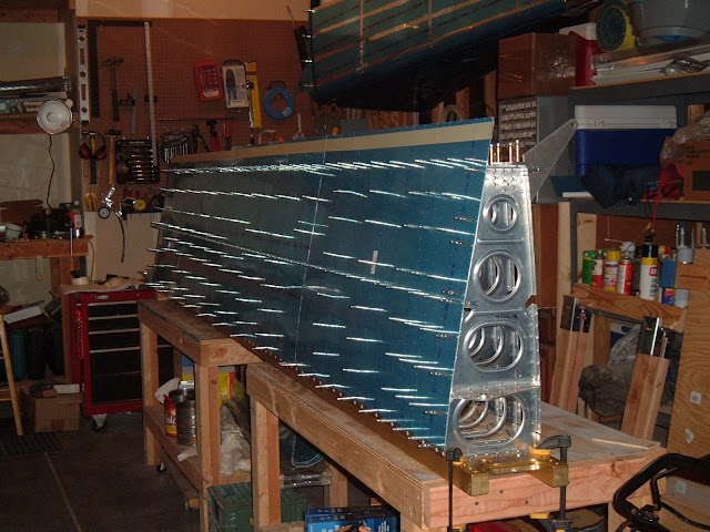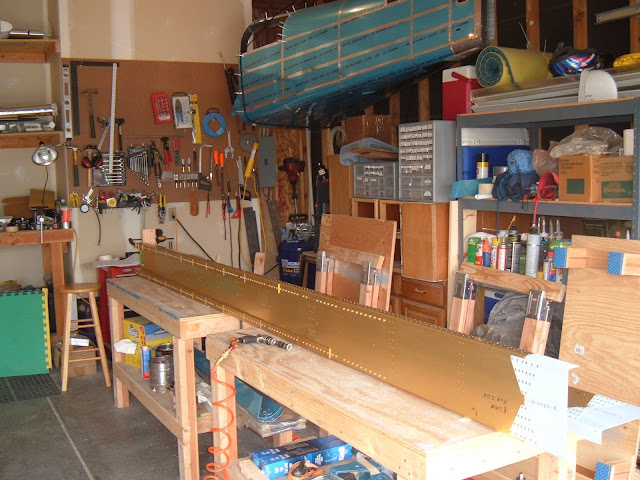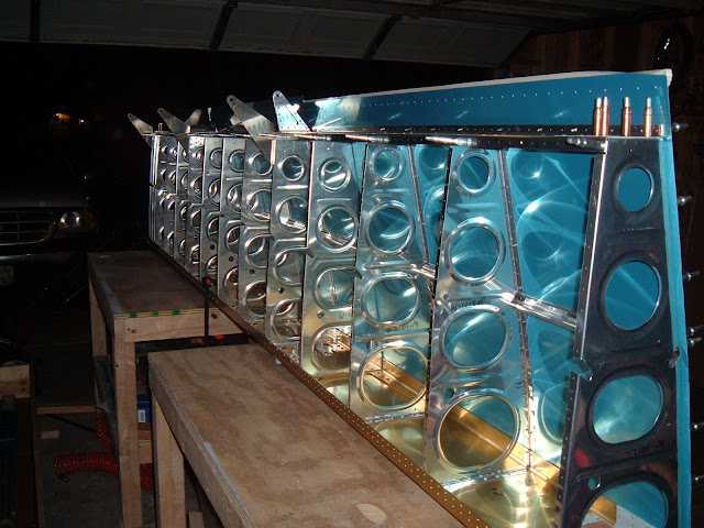 One wing with the top skins riveted in place (photo shows it in the cleco'd stage):