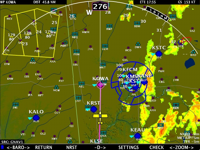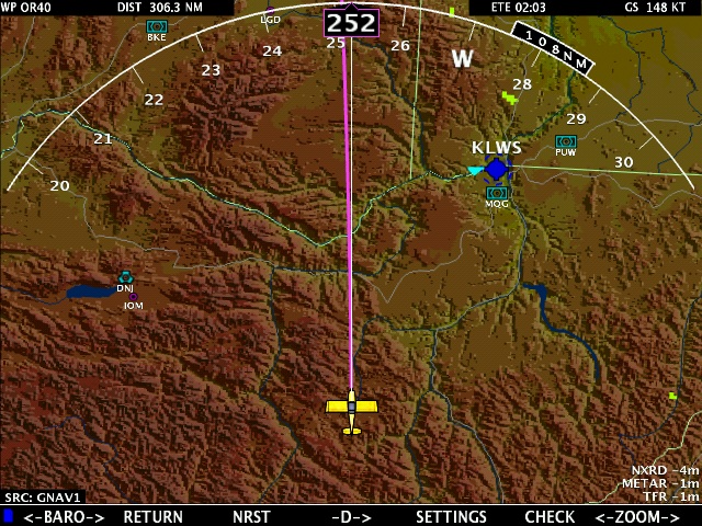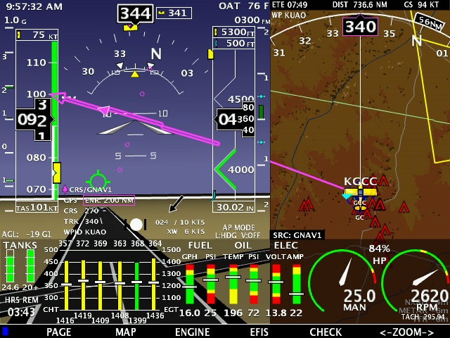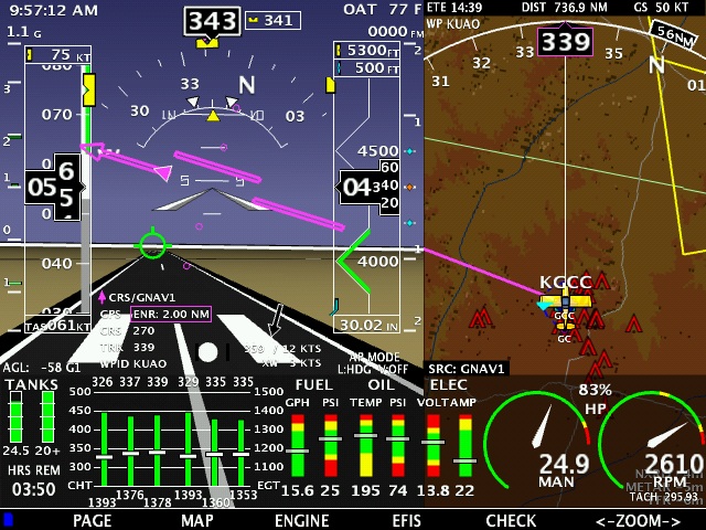 These are actual screen captures from my flight home from Oshkosh with the new software. These pictures show the new software with SV behind the engine gauges, Joy stick panning, HITS, and new terrain colors.