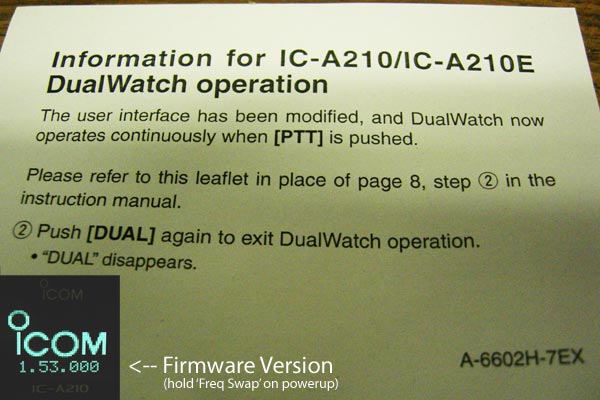 I just got my 210 back from the service center about two weeks ago. They did a minor repair on the faceplate, and upgraded the firmware (I presume to the latest that they had). I just went out to the hangar to check it, and the FW is version 1.43.000. Alas, I set up the Dual watch, keyed th emic...and the Dual Watch went away. So if they have fixed it, it is REALLY recent.