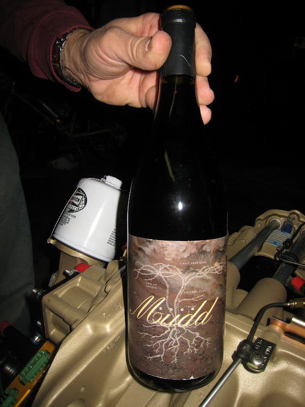 A few weeks ago, we were given a gift by one of our truest local RV friends, a gentleman unsurpassed in his generosity. Part of the Bohanon crew, he has a number of wonderful contacts at the Mattituck Skunk Works. His present was a bottle of 2006 Mudd wine. The grapes for the wine were grown by Nancy and Phil Hipponic, the team that for many years built all the race engines for Mattituck.