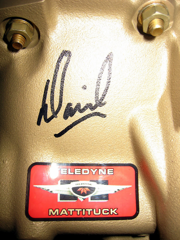 With the help of our airpark neighbors, the crate was apart and the new jewel ensconced in the garage in short order. The ?Red/Gold? engine even comes with the signature of the builder?thank you David (I need to find out your last name?)!
