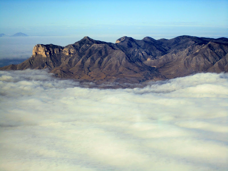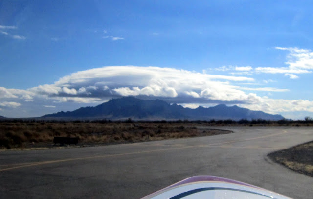 We decided to spend the night and visit with our RV friends Larry, Georg, and Linda, then press on in the morning. We could have pushed on to Demning, but it looked like e could get there in the morning as well, and that turned out to be the case, although we had to file IFR to get out of Carlsbad for an on-top cruise at 8,000. Since Carlsbad is below radar coverage for Albuquerque Center, it is a “one in, one out” IFR field. Louise learned that it makes sense to call for your clearance as soon as you get the engine started to get in line – we beat a Lear and a Cargo hauler that way. The tops were 6,000, which produced a spectacular picture of El Capitan and the Guadalupes: