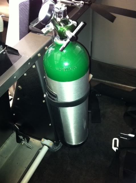 Had some time today to mount the Oxygen tank holder. I choise to try in center baggage compartment location, but raise it off the floor. In the seated postion I can turn my head to view the gauge and with my shoulder straps slightly loosened up can easily twist to open the valve. I'll try it like this for a while and see how it goes.