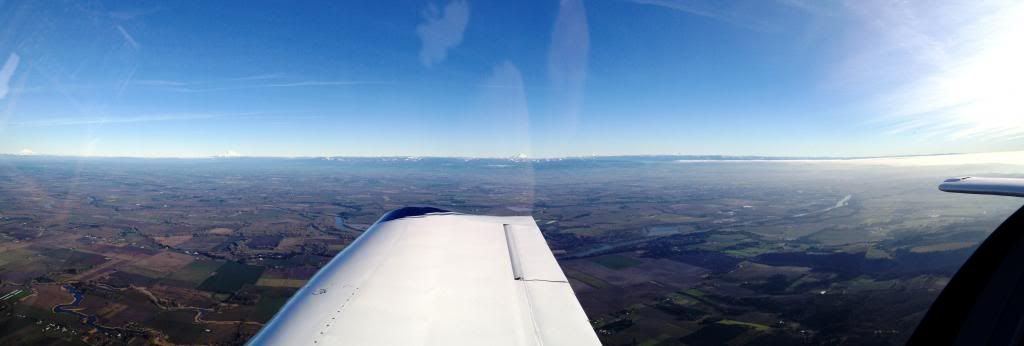 It took me a little while to figure out that the new iPhone software upgrade included a panoramic photo mode. That thing works great. You take a photo similar to a video while moving the phone and it stiches it together as a photo. Below is a sample shot from yesterday. I started just outside of the prop arc and went all the way to the tail. Other than the canopy glare it turned out great. This photo was downgraded 50% to post but you can still zoom in to see the mountains in the Cascade Range.