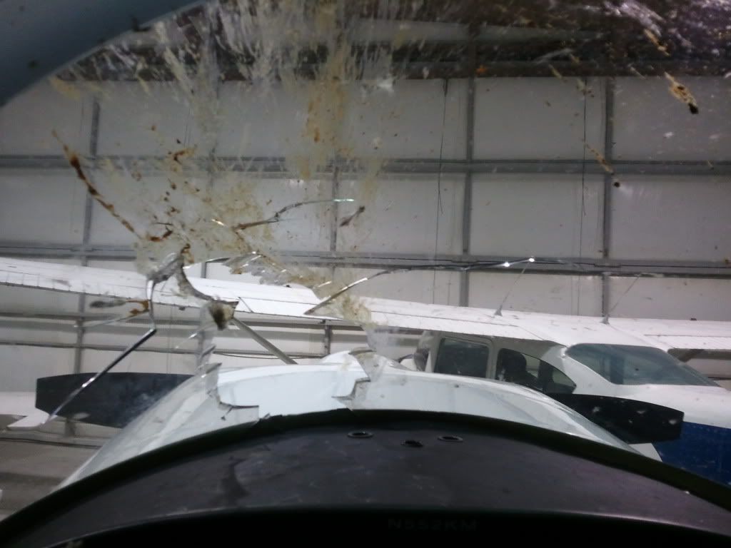 Guys, I've ferried quite a few ag airplanes that had hit tree limbs and big birds with a huge amount of damage. It's a dangerous condition when it happens to you in the air.