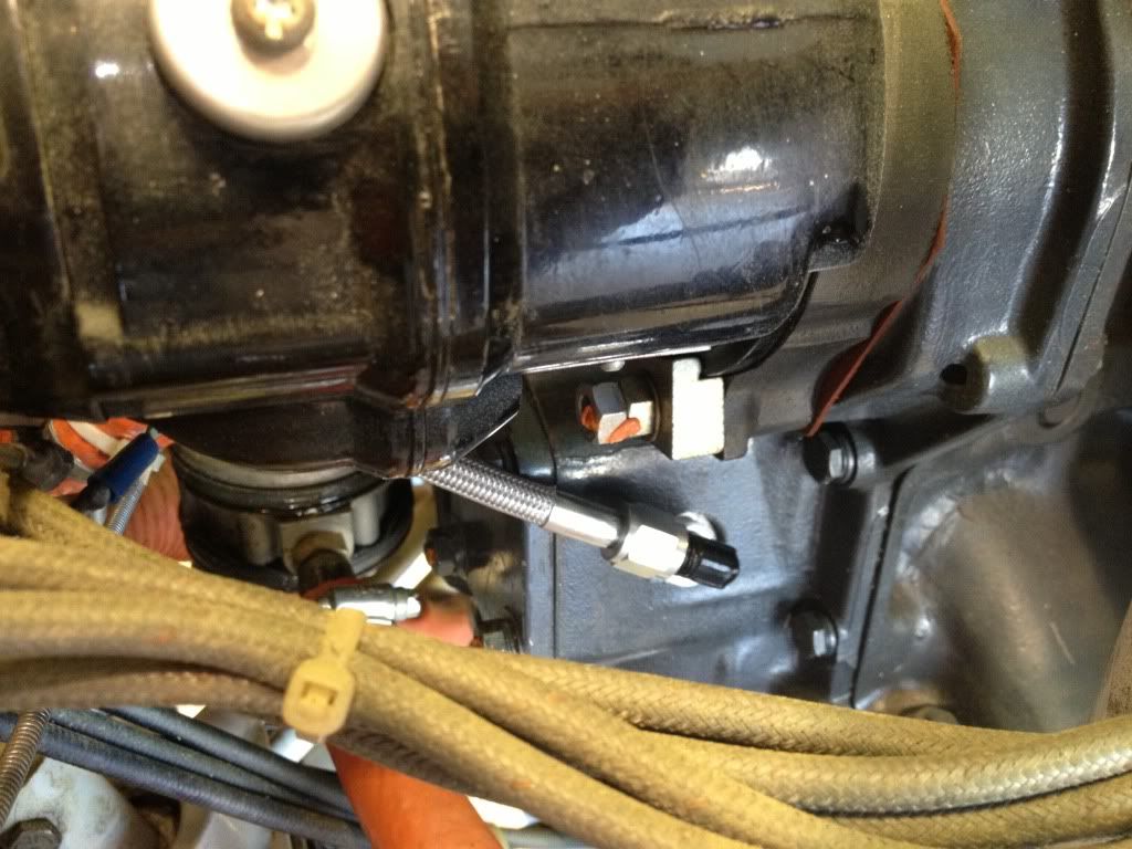 The 90* fitting supplied hits the engine mount, so I used a 45* fitting instead. It's the smaller fitting in this pic with the braided hose on it.