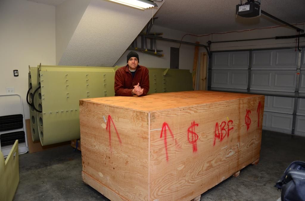 UPS finally found the train car which had my fuselage on it! This is me pushing it in the garage with the wings temporarily parked outside in the nice weather. Just finished installing the left aileron tonight. Man this is fun!