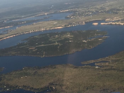We flew southwest to Possum Kingdom Lake so he could pick out landmarks from a few years back when he attended Grady Spruce YMCA Camp. I pointed out the ****'s Gate cliff that he sailed through: It's also the site of last year's Red Bull cliff diving competition. It's the gap in the ridge in the top right of this photo: