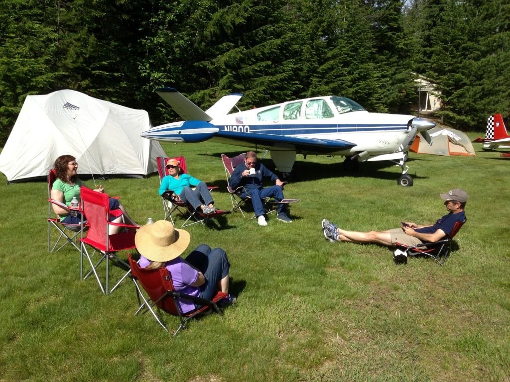 The line up of friends. 3 RV-7's and a Bonanza. also another camper in a C-185