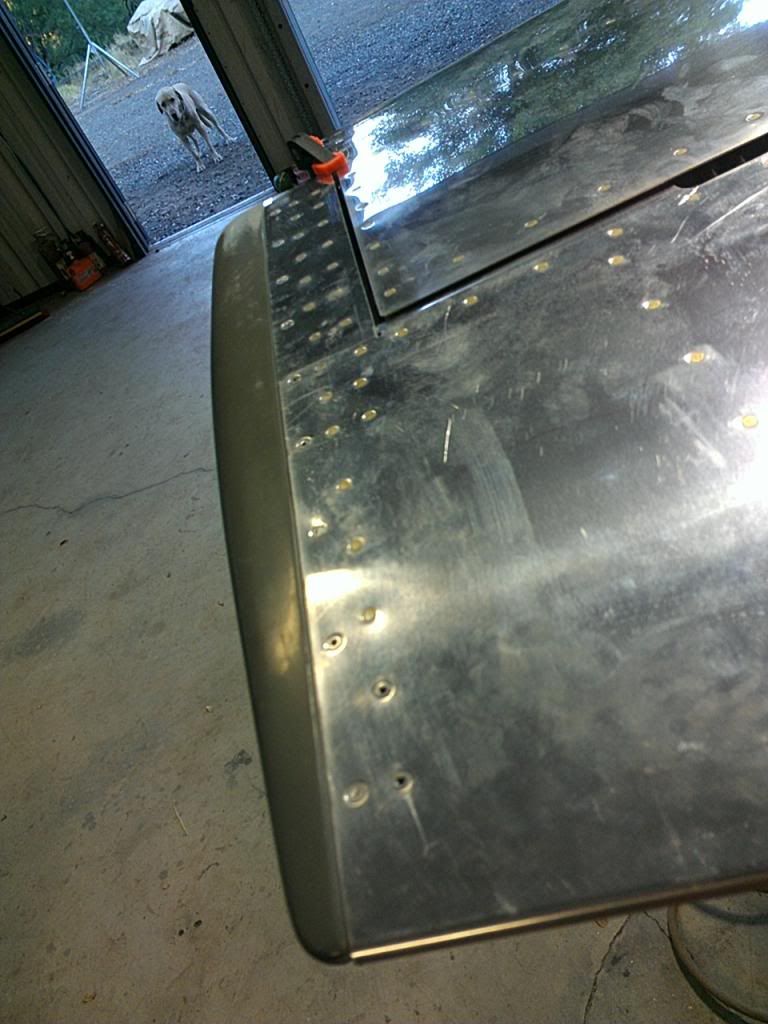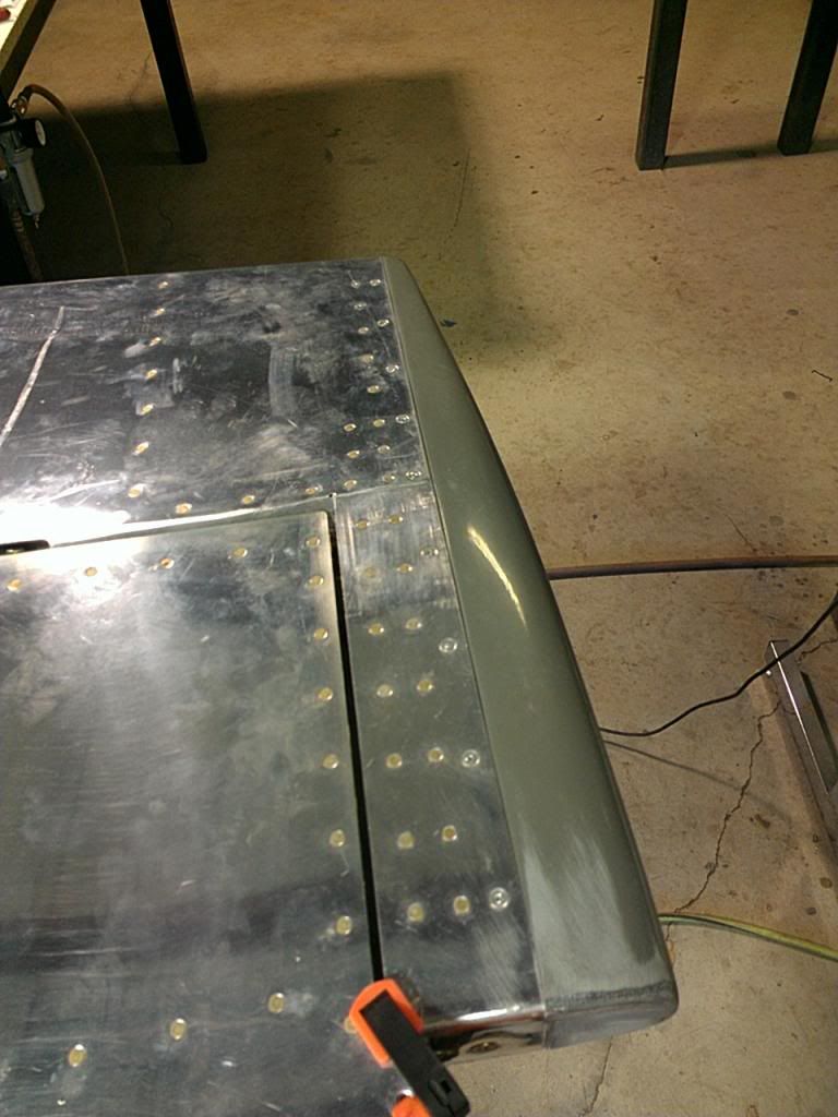 Finishing emp and fiberglass tips. I've seen ships where the builder blends the tip into the skin and then hides the first 3 rows of rivets. In this case the Horizontal stab and counterweight. I'm not exactly proud of that area but I don't think its wise to cover rivets with filler or expect the 'glass/aluminum line to not crack out at some time.