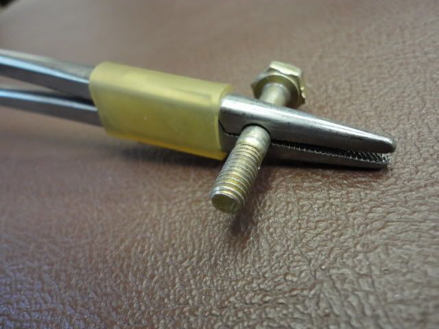 To drill the hole through the hemostat it needs to be firmly clamped in the drillpress vice. Start with a center drill and then enlarge the hole through several sizes to .185" (#13). Remember, use a slow speed and some lubricant for stainless steel.