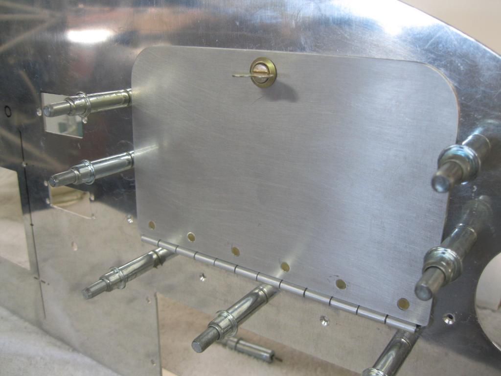 To make the final door install easy, the hinge will be fastened with pull rivets. The flat stock beneath the hinge is machine countersunk and solid-riveted to the map box floor. I didn't use the piece provided with the kit, because I couldn't figure out what was going on with the hole spacing!