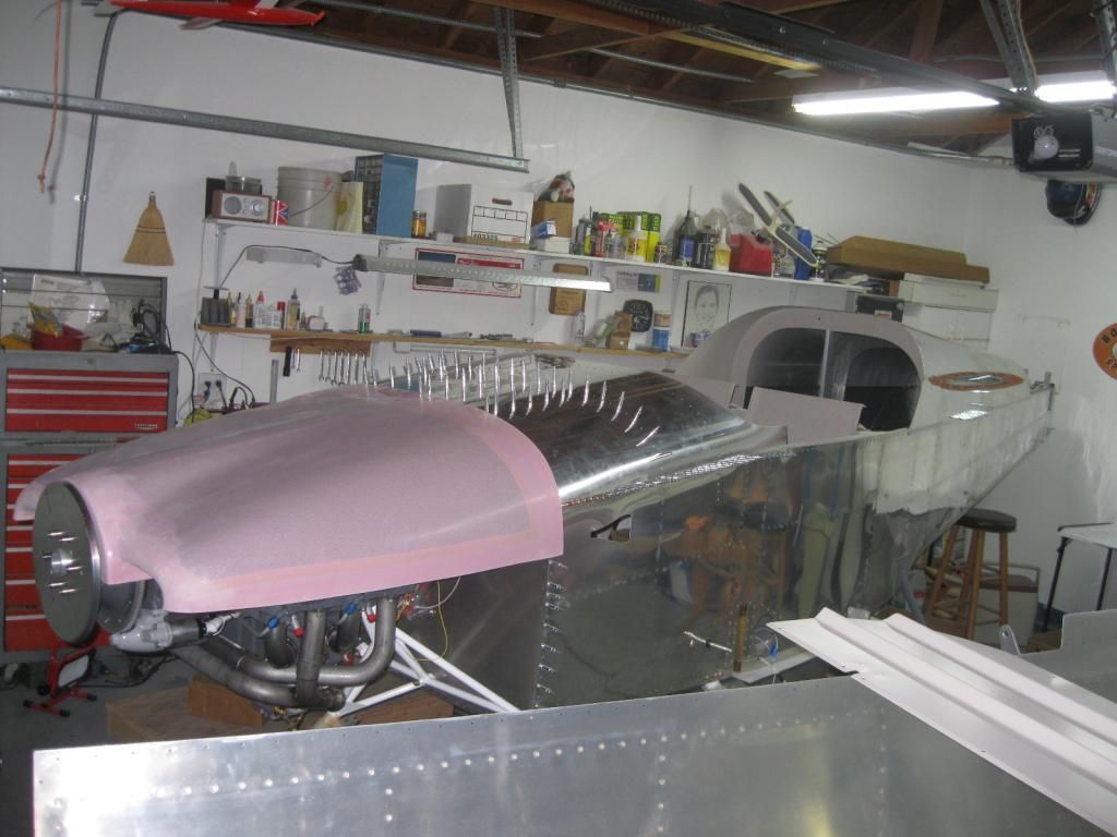 Welp, she's coming along nicely. The top rear skin is riveted in place (at least the rivets I can reach), the exhaust is fitted, control cables are hooked up to the fuel servo and the cowling is now in the midst of being fitted.