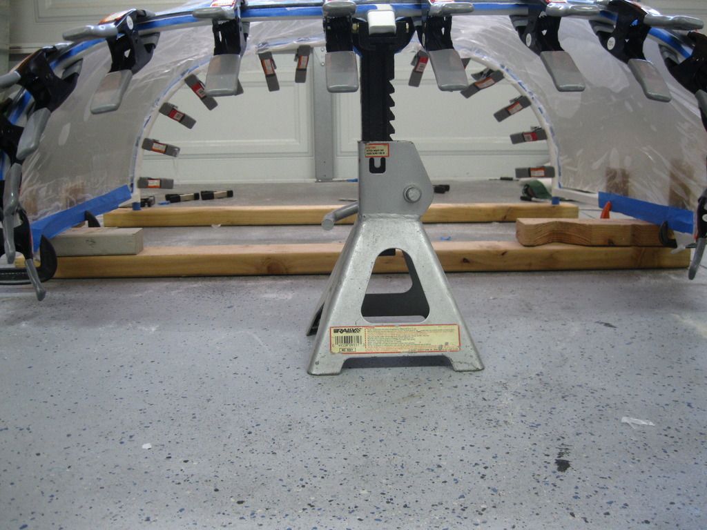 Time to drill a bunch of holes. But first, I needed some way to prevent the canopy frame from distorting/moving around while applying pressure from the drill. In front, I bored a couple of 7/8" holes in a 2x4 to accept the front hoop ends. Farther back, in front of the pins, another lateral 2x4 and some 2x4 chunks for support. And at the rear, under the spine at the "T" of the hoops, a jack stand with the pad covered in blue tape. Shim as necessary on the aft 2x4 to make sure there's no twist.