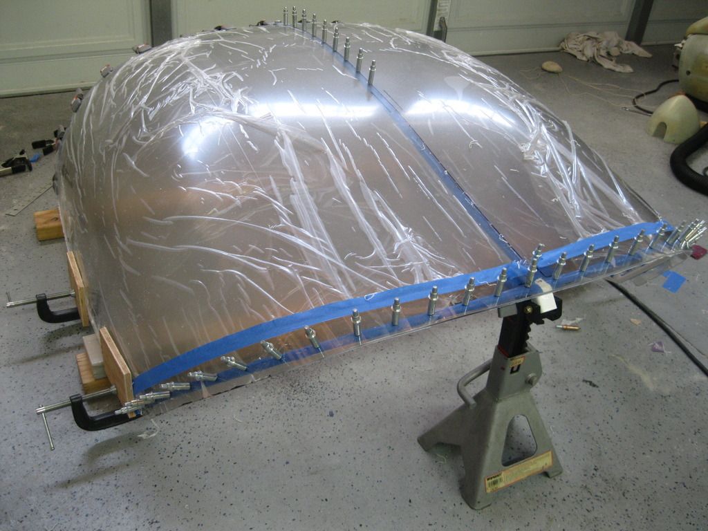 Next, the sides of the canopy tend to bulge out, which pulls the outer corners out of alignment for drilling. So clamp some plywood in a couple of places so the canopy matches the contours of the side rails in plan view.
