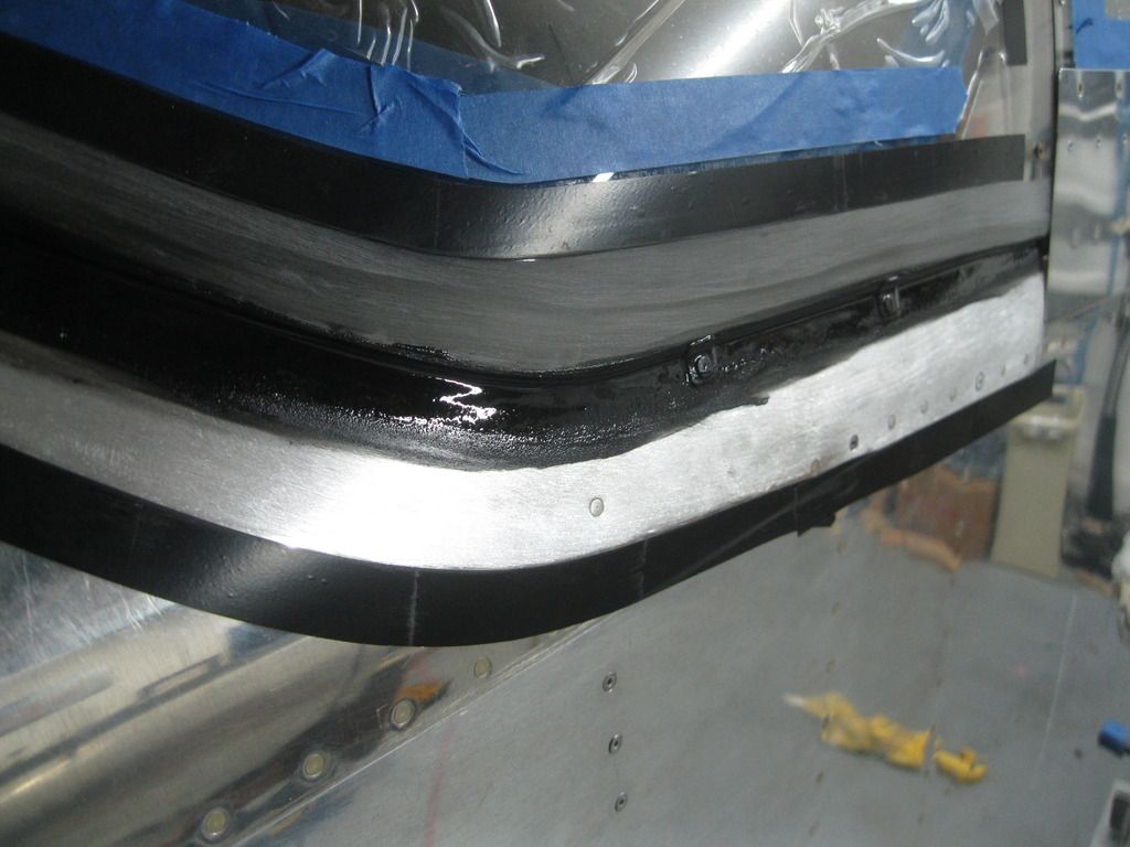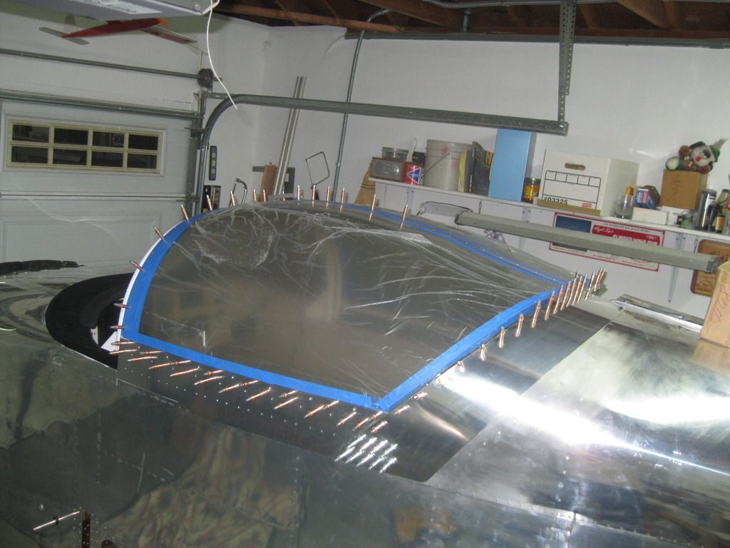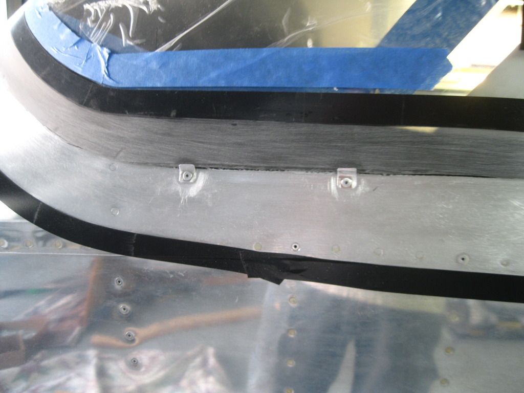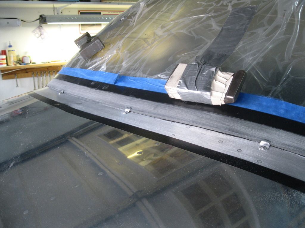 I used 8 clips total to secure the windscreen, and then an application of epoxy with about 75% cotton fibers, 25% microballoons and some black pigment. It was on the runny side, so I had to keep chasing runs as it dried, but it flowed enough beneath the screen for a good bond. There's still a ledge that needs to be filled with some dry micro before fiberglass. I used the tip in Van's video to use bucking bars as weights to get the windscreen to sit down flush...the picture is the problem corner, but ultimately I used two bucking bars here for a tight fit.