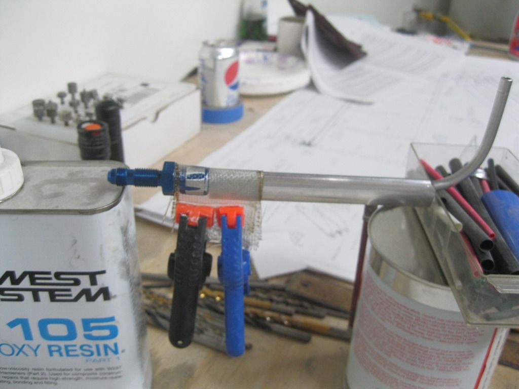 Tighten the B-nut to the bulkhead fitting securely, then file the edges of the B-nut to make a somewhat roundish shape. Rough up the airfoil tube, then wrap two layers of 9-oz. cloth around the whole mess, extending upward to the base of the bulkhead fitting. The fiberglass/resin will not want to stick to itself, so I used a couple of clamps, which hang down as the resin cures. The weight of the clamps also aligns everything nicely to the airfoil contours.