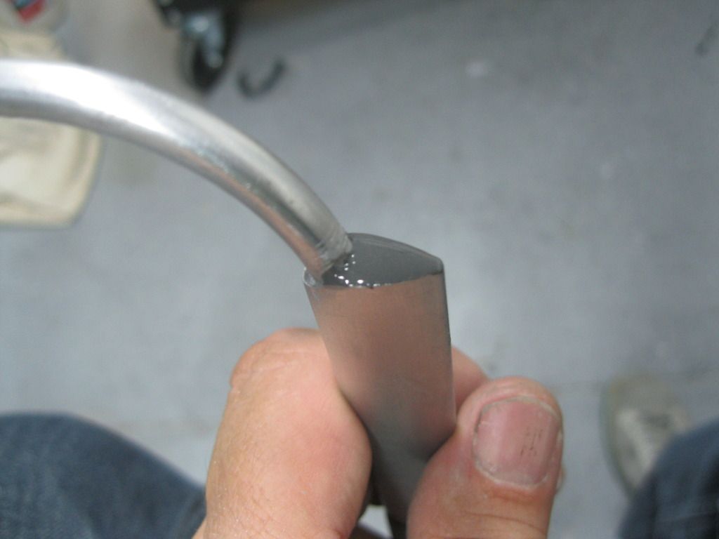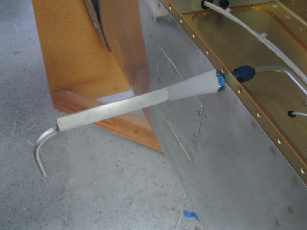 I bought some 3/4" K&S airfoil tubing at the hobby shop. That 3/4" dimension is the chord, but its size will just allow the 1/4" pitot tubing to slip inside, after tapping the trailing edge a little with a plastic-faced hammer to get it to bulge just a touch. Flare the tubing, install sleeve and B-nut, slide it inside the airfoil tubing and then make the 90-degree bend. Note the notch in the airfoil tubing on the inside radius, and the JB-Weld used to fill the void.