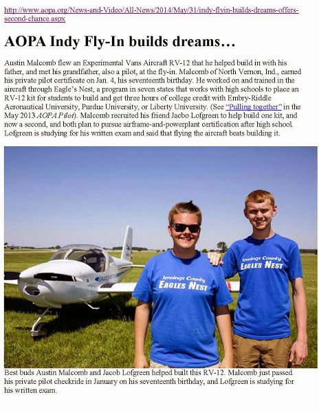 All of you can do like Jerry and meet these guys (and more like them) at our Family Reunion at Oshkosh. We plan on having our usual spot in Woods 101 for most of the week. Austin will be flying EN-1 in, and we will have three other Eagle's Nest RV-12s there, in front of the Homebuilt Hangar. Stop by and say "Hi!" You are welcome to join the family.