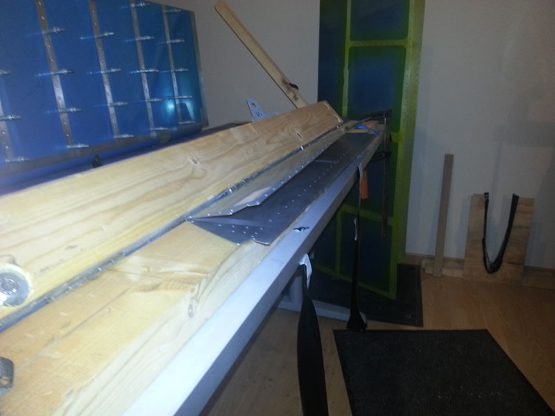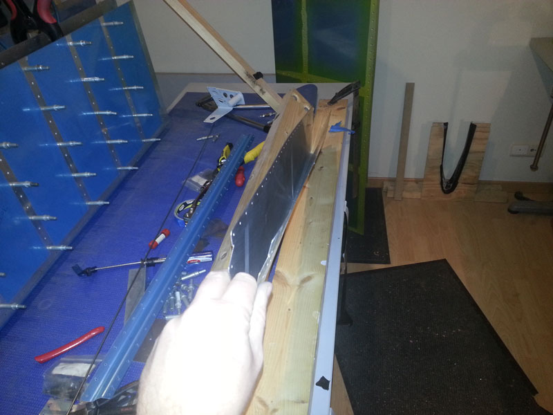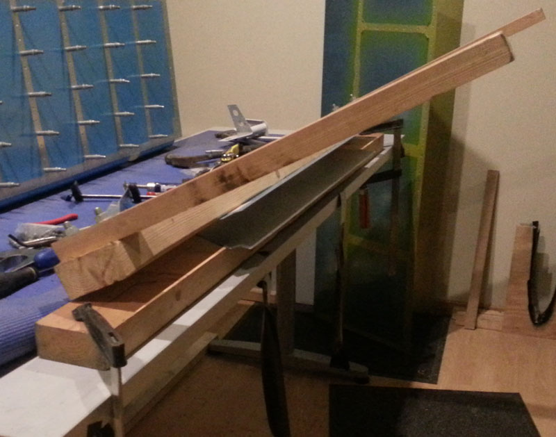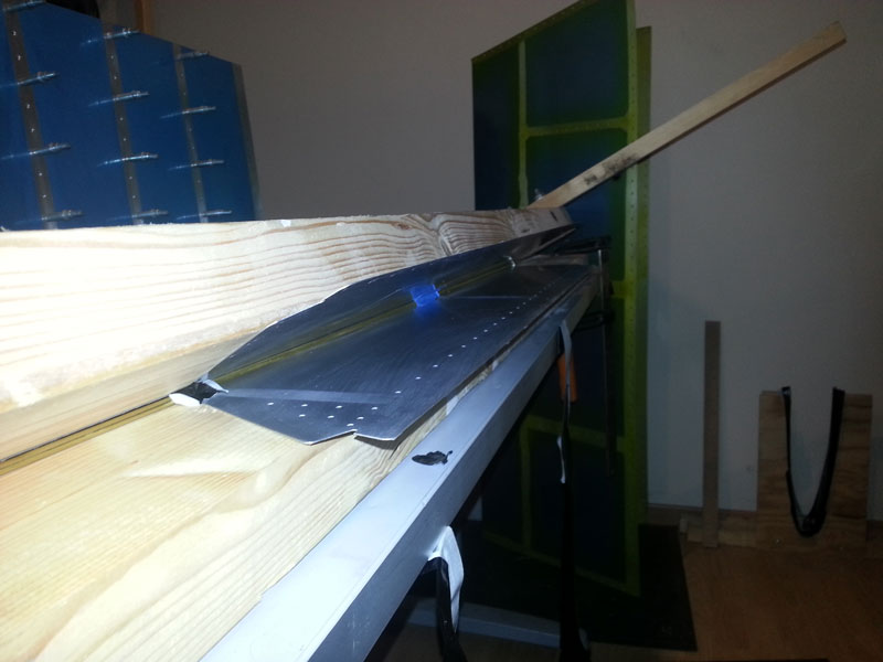 For the trim tab you really don't need the hinged press (or for the rudder and elevators actually). I just put a 1/4" diameter wooden dowel inside and squeezed the tab between a piece of wood and a flat bench top with some c-clamps. You will squeeze it flat (with the TE radius) to get the proper angle with spring-back (and flat skins). Use the trim tab spar to check the bend.