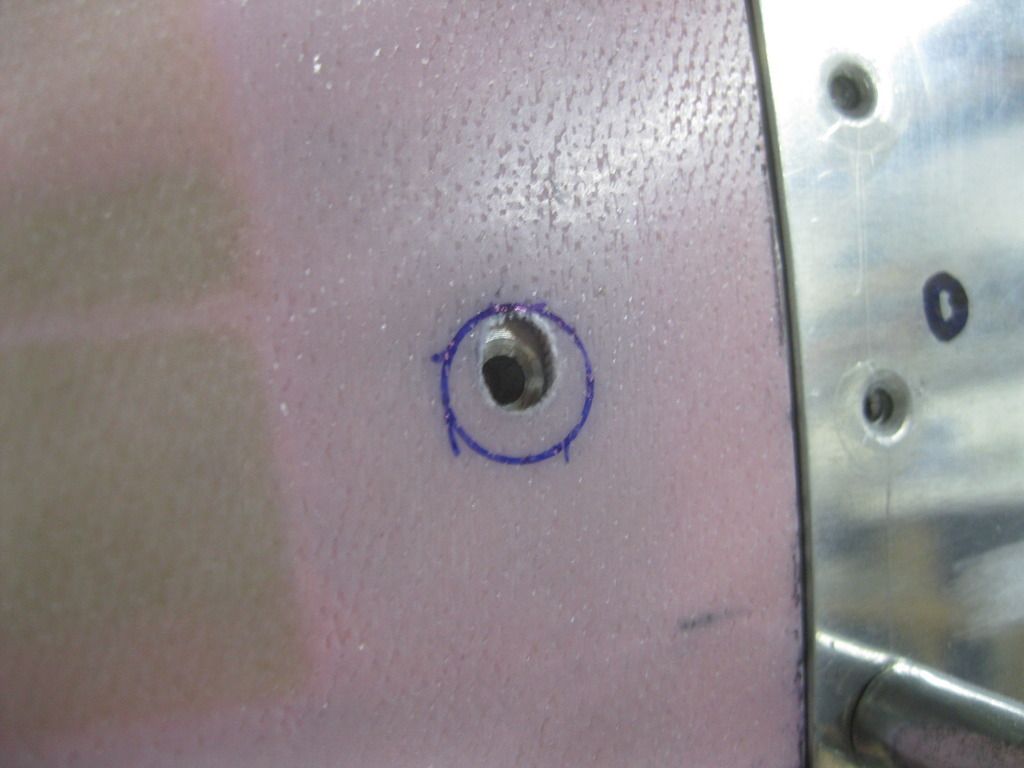 Once I modify the pilot hole enough to get the cleco into the machined aluminum spacer behind, I just trace around the base of the cleco with a fine-tip Sharpie. This circle is still a little undersized for the final grommet, but it'll give an excellent, centered baseline hole that I can enlarge with the tapered reamer.