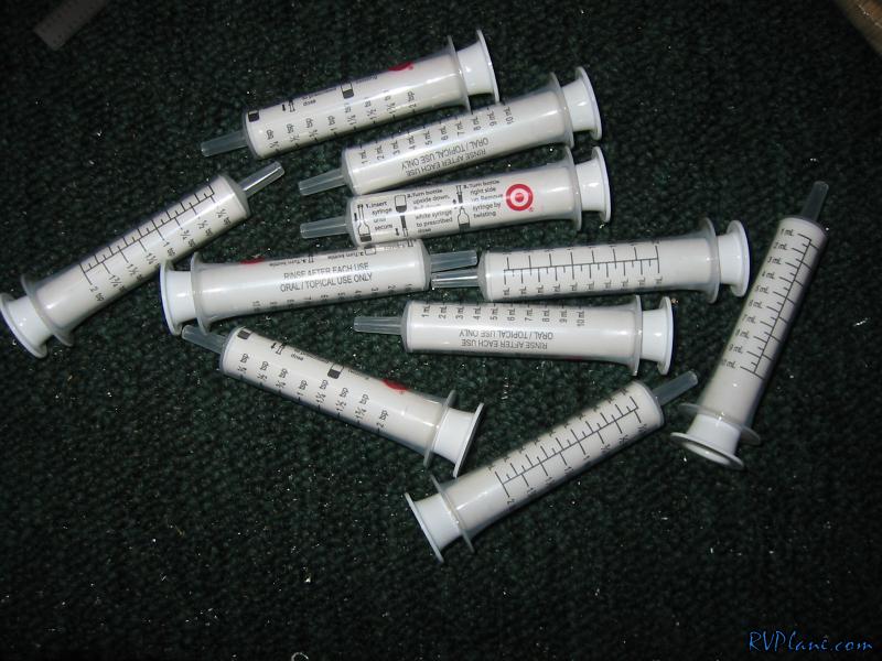 When I was doing my tanks back in 2006, I was able to get free syringes from the pharmacy counter at Target. They worked PERFECTLY for sealing the tanks, and the price was right!