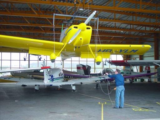 All this is connected to an steelbar which hangs on a electric winch. The winch itself is on a slider, so it is possible to take it to the front area of the hangar to let them down. Yo do not need to took all other planes out to go flying!