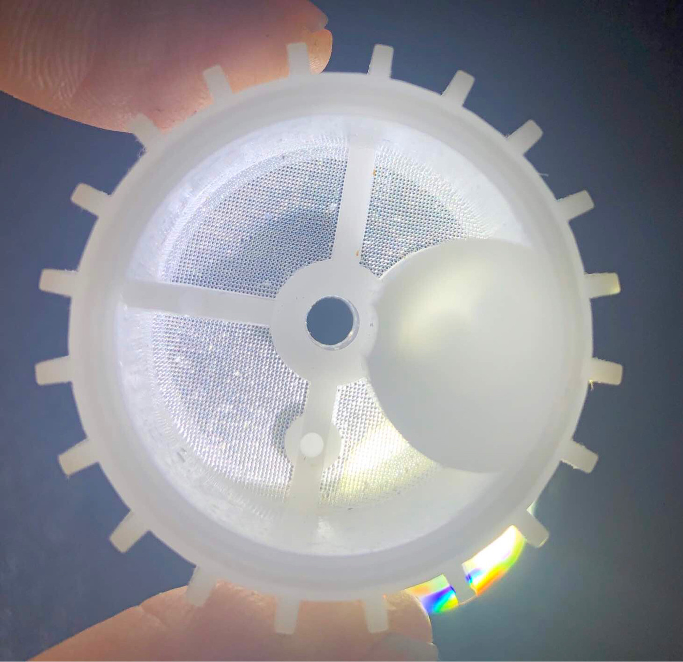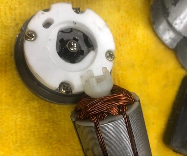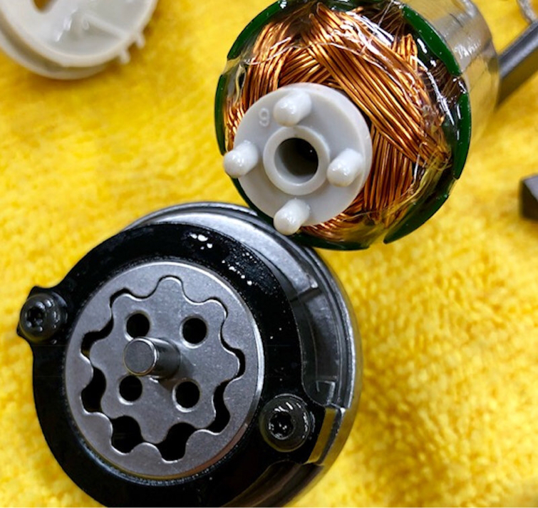 The second photo details the gerotor, a marvel of simplicity that has a very reassuring feel when rotated manually, and I’ve included a link to a video of it in action. The inner and outer gear profiles are ingenuously ground so that each lobe maintains precise contact with its neighbor at all times, creating sealed cavities that grow and shrink in volume when rotated. With this design, the inner planetary gear is concentric and also directly driven by four plastic fingers at the end of the armature. The outer ring planetary is driven by the inner gear to rotate within an offset bushing. Notice in the video that the inner gear has eight teeth, and the outer gear nine, so with each rotation the outer ring retreats by one tooth position.