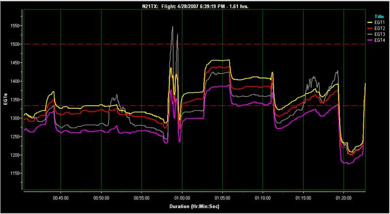 After checking the plane over and making sure there were no fluids leaking or no obvious problems, I sat there and thought about it. I reasoned it must be an ignition problem and most likely the electronic side with such a difference. I tested and found she would run at full power after passing through the stumble area. So, I headed home and downloaded the flight data files and analyzed it with EGview.