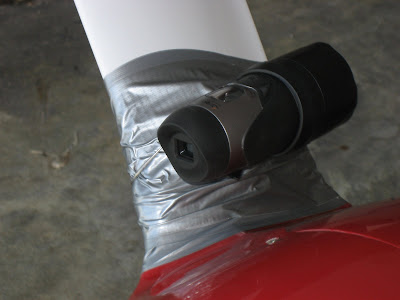 I mounted the camera on the gear leg with it's Velcro strap, overlaid with vinyl tape (which leaves very little residue), overlaid with duct tape on top of that, and finally, a loop of safety wire around the camera and gear leg - hey, I'd hate to lose the thing in less than a week!