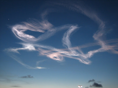One of the most bewitching moments of the evening, however, came about 45 minutes later as the sun was sinking below the horizon, and we looked up and to the west. There in the darkening blue was a spectacular array of ?clouds??no, they couldn?t be clouds, they were too bizarre and twisted?.in fact, the looked like a contrail, turning and twisting on itself, with circles and lazy turns.