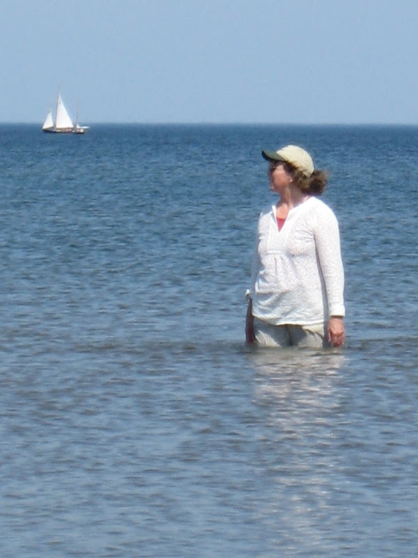 The beach is just over the dunes from the runway, and we took along our little bag of crackers, smoked fish and fresh cheese curds...a bottle of wine would have been great, but hey...."twelve hours from Bottle to Throttle!" We had a wonderful little picnic sitting on the dune, watching the hardy folks p[laying in the water. I guess I have lost some of my early resistance to cold water - back in my day, the water temperature on the north shore was about 38 degrees all year round. Park Point, being sand, probably heats the local water a bit, but still....these folks looked like they were ENJOYING it! Louise took a little wade, and with the sailboat in the background, you might think we were in the tropics - and not north of the 45th Parallel!