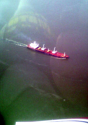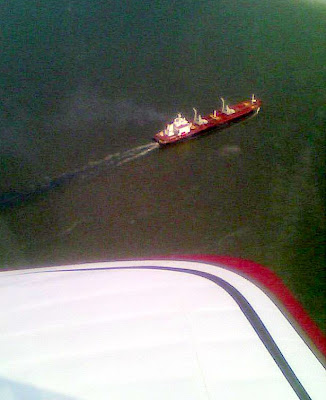 My cell phone rang about 1330 hours local time..."Hey Paul, we're casting off lines in Deer Park right now, outbound down the Houston Ship Channel. We'll probably be four or five hours getting to Galveston if you want to do a flyby!" Looking at my watch, I realized that I didn't need to be in MCC for a few hours or a late meeting, so I grabbed my stuff and headed to the airport. Just before I cranked up, I called on the phone and said I was about 12-15 minutes out, and found that the ship was just passing Redfish reef. Sure enough, I found him just where I expected, and made a few passes to let them have a good look. It's nice to have a ship that is bigger than the 500 foot legal separation limit - I just stayed twice as far away as the ship was long, and I was clear! After a couple of circles, a wingover off the bow, and a couple of photo passes, I gave a snappy wing rock and headed home.