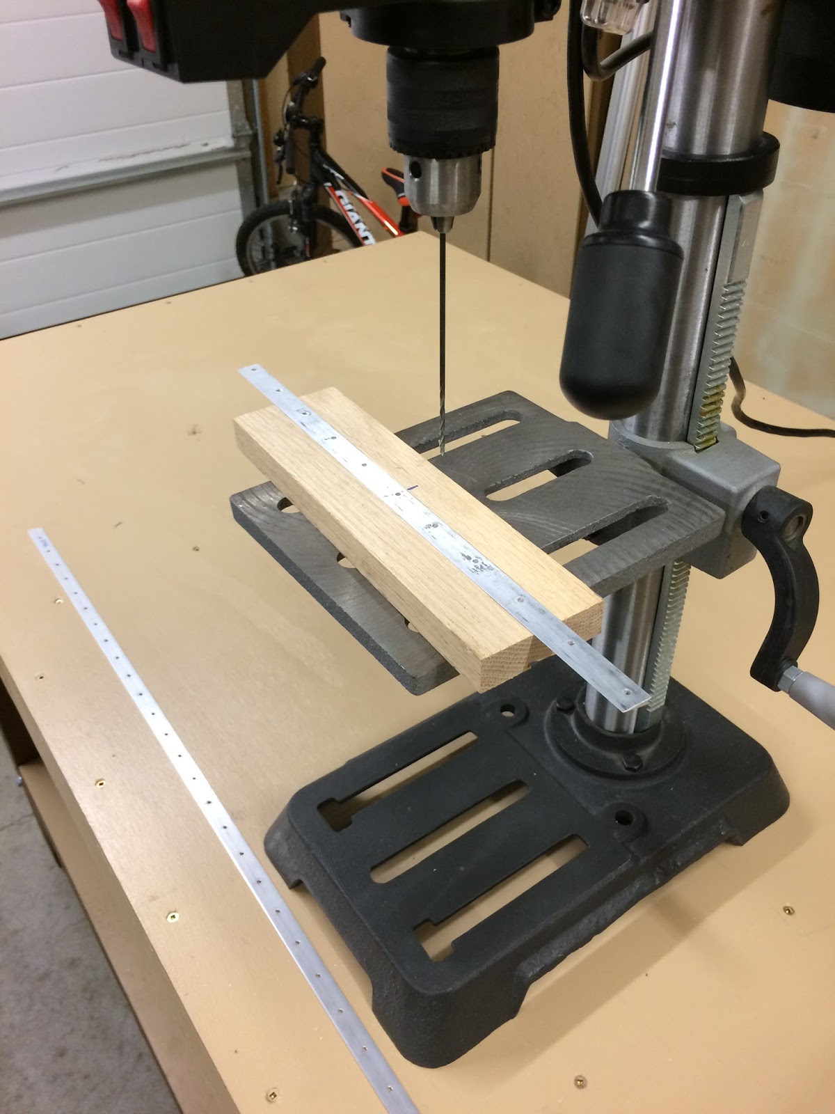 I had an idea to use a block of wood as a jig to countersink the trailing edge wedge. I cut an angled groove (approx 9 or 10 degrees) in the center of a piece of oak with the table saw. It took a few scraps and a few adjustments but I dialed it in so that the wedge sat in the wood block with the exposed side perfectly level with the face of the block. This allows the countersink cage to be properly supported when countersinking the holes. I drilled a #40 hole in the center of the piece to allow the pilot of the countersink bit to go through. It worked better than I imagined! Holes came out perfect!