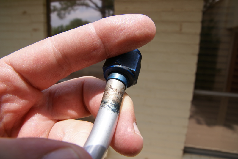 The best guess of me and my cohorts is that the mounting of the fuel pressure transducer was flexible enough to allow a resonant vibration that over time cracked the line at the edge of the ferrule.